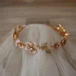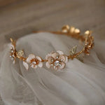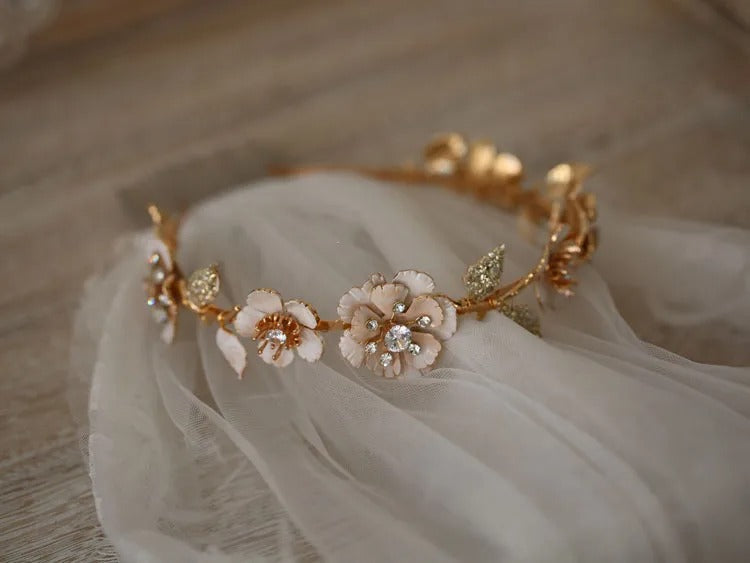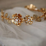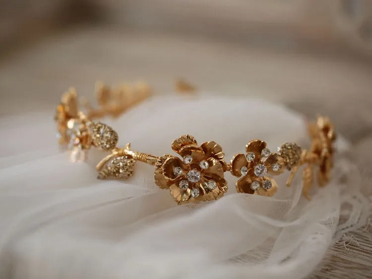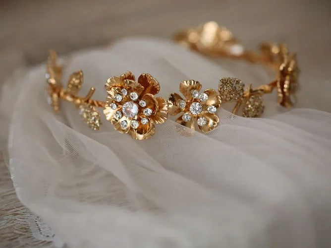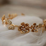 Embrace your inner goddess with the Serena Gold Floral Wedding Crown Headpiece. This bohemian piece features a delicate garland of hand-crafted gold leaves and sparkling crystals, creating a romantic and whimsical look perfect for your special day.